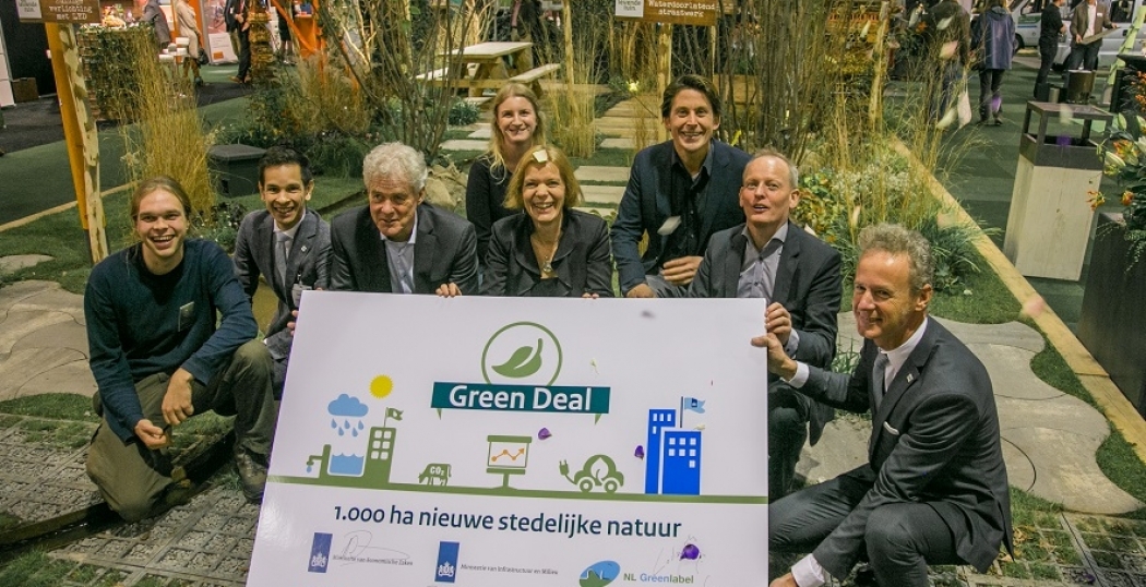 Tijdens het vakevent Future Green City op 24 november in ‘s-Hertogenbosch is de Green Deal ondertekend voor de realisatie van 1.000 hectare nieuwe stedelijke natuur. Branchevereniging VHG en NL Greenlabel zetten hiervoor hun handtekening, samen met vertegenwoordigers van het ministerie van Economische Zaken, het ministerie van Infrastructuur en Milieu, de Vereniging Nederlandse Gemeenten, de Vlinderstichting en Bureau Regelink Ecologie en Landschap.