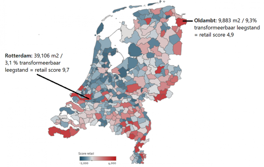 De Transformatieatlas Retail geeft de kansrijkheid van winkeltransformatie per gemeente weer. Net als de winkelleegstand liggen de meest kansrijke gemeenten verspreid over het land. Stedelijke gebieden binnen en buiten de Randstad hebben door de grotere winkelvoorraad over het algemeen een grotere transformatieopgave dan kleinere gemeenten. Grote steden als Den Haag, Eindhoven, Breda, Assen, Roermond, Ede en Veenendaal hebben veel transformatiemogelijkheden. Rotterdam heeft bij uitstek de grootste transformatiepotentie. Enerzijds staan er relatief veel winkels leeg en tegelijkertijd is het woningmarktperspectief erg gunstig.