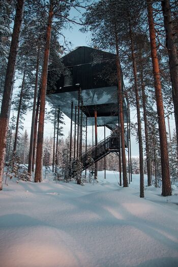 Een trap brengt de gasten van de bosgrond tot in de cabine. Een lift is aanwezig voor het vervoer van bagage. Twaalf steunpalen dragen de cabine, waardoor de belasting op de bomen wordt verminderd. Het onderkomen is gebouwd op traditionele Scandinavische wijze. De gevel is bekleed met grenenhouten planken, de vloer is gemaakt van essenhout, terwijl berkenhout is gebruikt voor de binnenwanden.