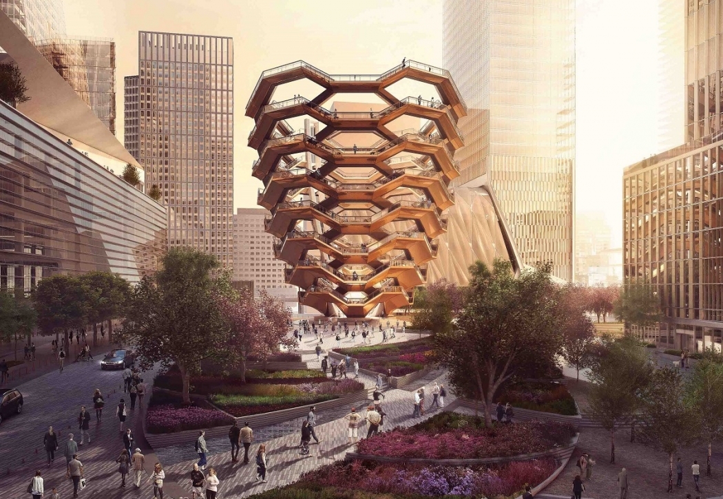 Thomas Heatherwick van Heatherwick Studio brengt een nieuw monument naar New York City. Het vijftien verdiepingen hoge kunstwerk, genaamd Vessel, bestaat uit 154 afzonderlijke trappen die stuk voor stuk aan elkaar verbonden zijn.