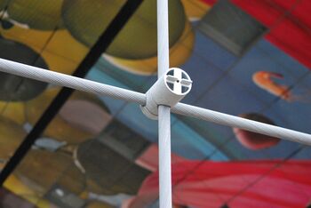 Ed ’t Hart, AGC Glass: “We zijn erg trots dat we het glas hebben mogen leveren van dit pronkstuk in Rotterdam. Uiteindelijk zijn er glaspanelen gebruikt van 1,5 x 1,5 meter. Deze zijn op elk hoekpunt gekoppeld met een knooppunt van het kabelnet. Het bijzondere is dat de panelen torderen met het kabelnet, ze buigen zo ook mee met de wind. De combinatie van staal en glas zorgt voor een uiterst veilige, stabiele en duurzame constructie.”