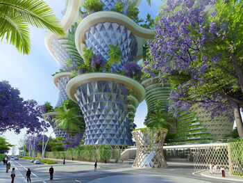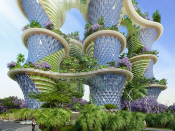 Impressie van de Hyperions, torens die landbouw, wonen en werken combineren.