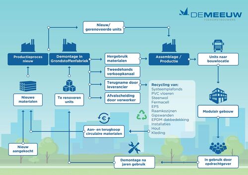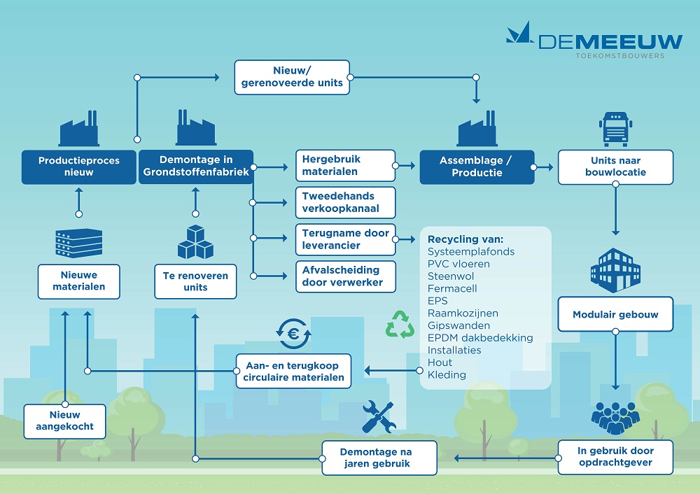 Dat model werkt als volgt: De Meeuw produceert een nieuwe of gerenoveerde bouwmodule, die in de fabriek wordt geassembleerd en als modulair gebouw op de bouwlocatie wordt neergezet. Na de gebruiksfase neemt De Meeuw de gehele module terug om te demonteren in een grondstoffenfabriek. Zo kunnen alle grondstoffen worden hergebruikt in het eigen assemblageproces, worden doorverkocht via een delver of worden gerecycled via een betrokken leverancier. Door het inzicht in welke grondstoffen exact aanwezig zijn in een bouwmodule, kan de methodiek van Cadac extra bijdragen aan dit proces.