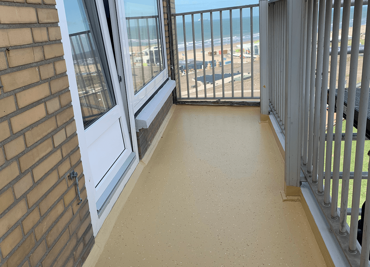 Langs de boulevard van Scheveningen is een royaal appartementencomplex gesitueerd. Helaas ontstond er op de balkons na verloop van tijd een verouderde tegelafwerking, die geen bescherming meer bood aan de betonnen constructie. Daarom wenste de opdrachtgever een nieuwe duurzame afwerking als vervanging van de oude tegelafwerking. Daarnaast moest de nieuwe coating, als duurzame bescherming van de constructie, bestand zijn tegen de vele extreme invloeden langs de kust. Te denken aan zout, zand, extreme windkracht en sterke temperatuurschommelingen.