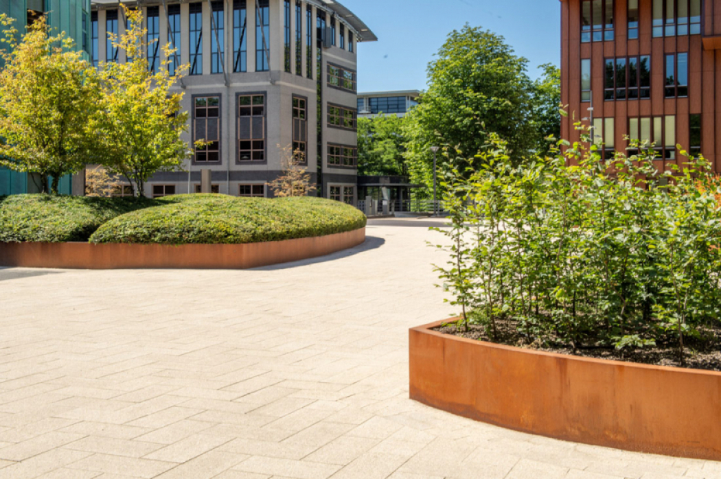 De ontsluiting en toegankelijkheid van het terrein wordt behouden, maar binnen het raamwerk wordt het straatbeeld vergroend en worden er verblijfsruimtes gecreëerd. Studio REDD is gevraagd om de plannen voor de groene buitenruimte nader uit te werken en gereed te maken voor realisatie. Zij kozen voor de Palladio steen uit het Metten programma omdat de warmgrijze kleurschakering van de steen een referentie is naar de omliggende zand- en heidelandschappen. Deze zorgt - samen met de vergroening - voor een verblijfskwaliteit verhoging in het kantorencluster.