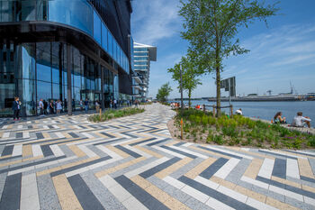 Het Haagse ontwerpbureau Sant en Co tekende uiteindelijk voor het ontwerp van deze buitenruimte. Begin 2019 is de kop van de Danzigerkade op de voormalige Houthavens opgeleverd waar 12.000 m2 aan stenen uit de La Linia® en de Boulevard® serie in amper 12 maanden tijd zijn verwerkt in een zeker niet alledaags patroon wat geïnspireerd is op parket en de link legt naar het hout wat hier ooit aan land kwam.