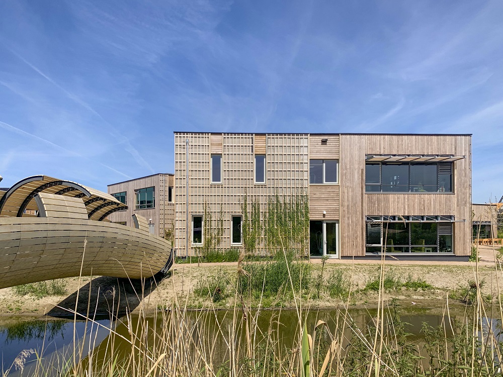 ORGA architect is een echte pionier in het bouwen met hout en andere biobased materialen. De materialen en technieken in het hybride CLT/houtskeletbouw schoolgebouw zijn duurzaam, divers en innovatief: draagkolommen van geschaafde boomstammen, houten kanaalplaatvloeren, Marmoleum, binnenwanden van ongebakken leemsteen, akoestische kurkwanden, natuurlijke ventilatieluiken en een ijsbuffervat in de grond voor warmte en koeling. Een groot deel van de binnen- en buitengevels worden bedekt met zelfgroeiende groenwanden.