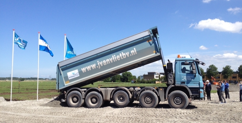 Wethouder Eijking van gemeente Weesp gaf woensdag 11 juni 2014 door middel van het storten van de eerste vracht zand het startsein voor het bouwrijp maken van Leeuwenveld3, samen met Eltjo Bouwman, directeur wonen bij Blauwhoed, en Menno Smits, direc