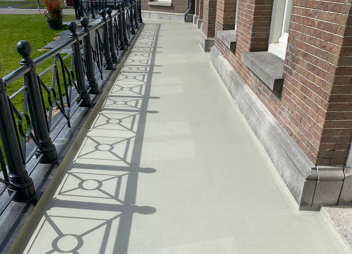 Het project is naar wens opgeleverd. De unieke uitstraling van het bordes is behouden gebleven en de vloer is door de juiste stroefheid weer veilig beloopbaar en volledig waterresistent door de ijzersterke en naadloze afdichting.