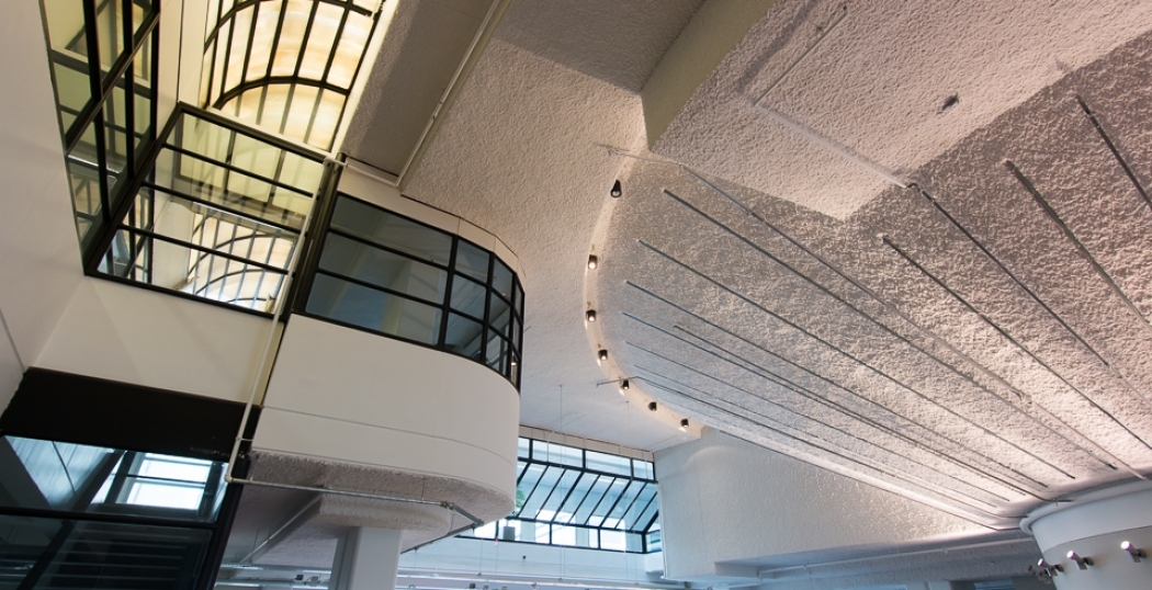 De ruimte moest omgevormd worden tot een open kantoorlandschap, maar omdat er indertijd andere akoestische eisen golden en het oude universiteitsrestaurant best rumoerig mocht zijn, was er een enorme nagalmtijd. “Het is een hele harde omgeving, alles is van beton,” aldus Rob van Beek van Asona, verantwoordelijk voor het akoestisch spuitwerk van de ruimte. “We konden alleen iets doen met het plafond en enkele wandgedeeltes, dus om zoveel mogelijk geluidsabsorptie te bewerkstelligen, hebben we daarop de Sonayspray ST L-13 toegepast."