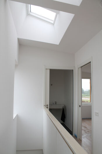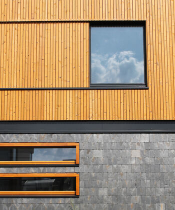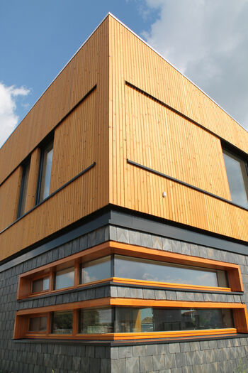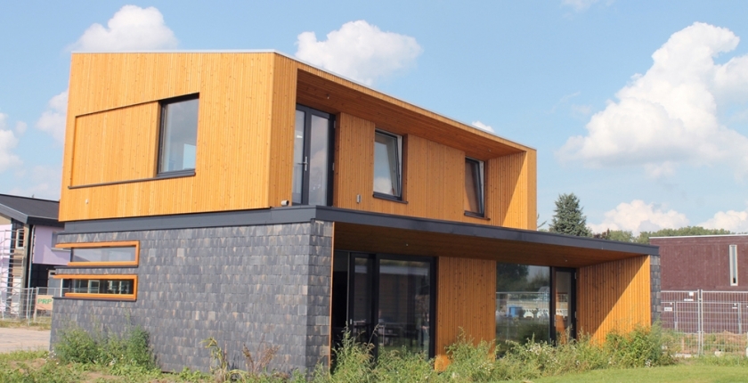 "Wat betreft materiaal is gekozen voor snel groeiend vuren en lariks. Om het vurenhout geschikt te maken voor een toepassing als gevelbekleding is het thermisch verduurzaamd. De warme kleur blijft behouden door een behandeling met sansin, een soort pigment. Alle buitenkozijnen zijn gemaakt van lariks hout. De dakramen vervullen daarbij een dubbelrol: ze laten veel daglicht door en in de zomernacht zodra je ze opent kun je de woning koelen."