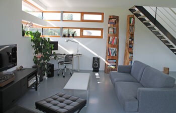 Uitgangspunt was een huis te maken dat kon leven met de elementen. Zo zouden zij optimaal van het licht en de warmte van de zon gebruik kunnen maken en dat scheelt in het energieverbruik. Dus wakker worden aan de oostkant van het huis met de eerste zonnestralen in de slaapkamer en de woonkamer en het atelier aan de westkant, de plaatsen waar de bewoners vooral in de namiddag en avond verblijven.