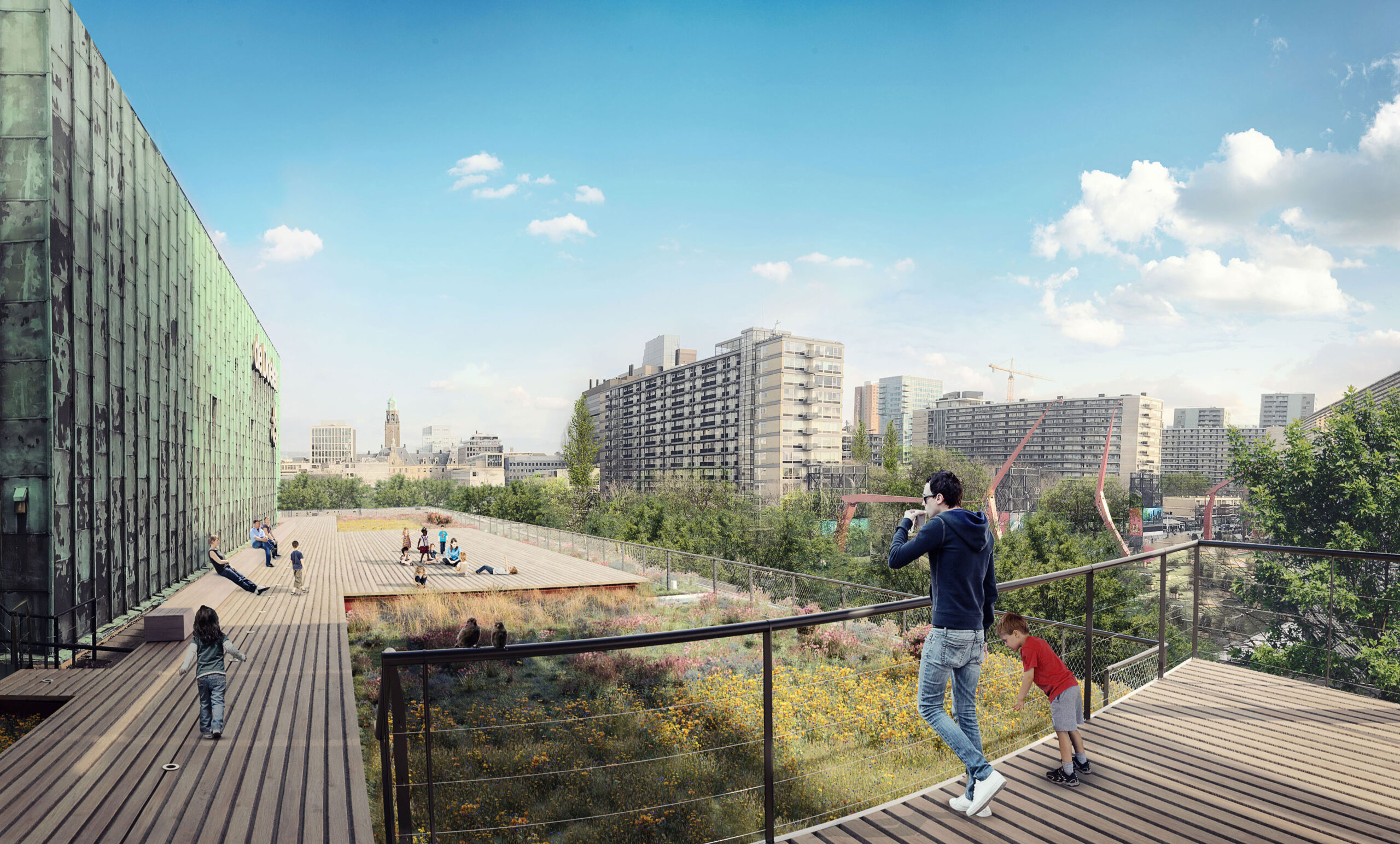 Aan Schouwburgpleinzijde komt op het dak een houten vlonder van 480 m², die bestemd is voor educatieve, sociale en culturele activiteiten. Als het dak klaar is, is het nog niet algemeen toegankelijk voor publiek, maar worden er wel rondleidingen gegeven. Mogelijkheden om het dak in de toekomst wel voor het publiek toegankelijk te maken worden verder verkend.