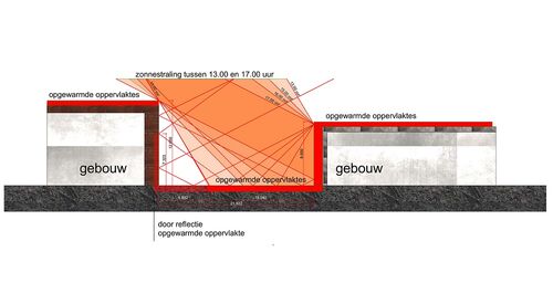 Een straatdoorsnede waarop de inkomende zonnestraling en reflecties zijn aangegeven.