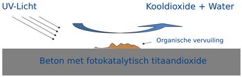 Titaandioxide is in de vorm van anataas het meest geschikt om een fotokatalyserend effect te bewerkstelligen. Het normale anataaspigment, dat wordt gebruikt om beton lichter te kleuren, heeft deze fotokatalyserende werking. Hoe ziet dat proces eruit? Zie hier de illustratie.