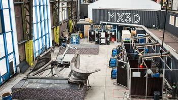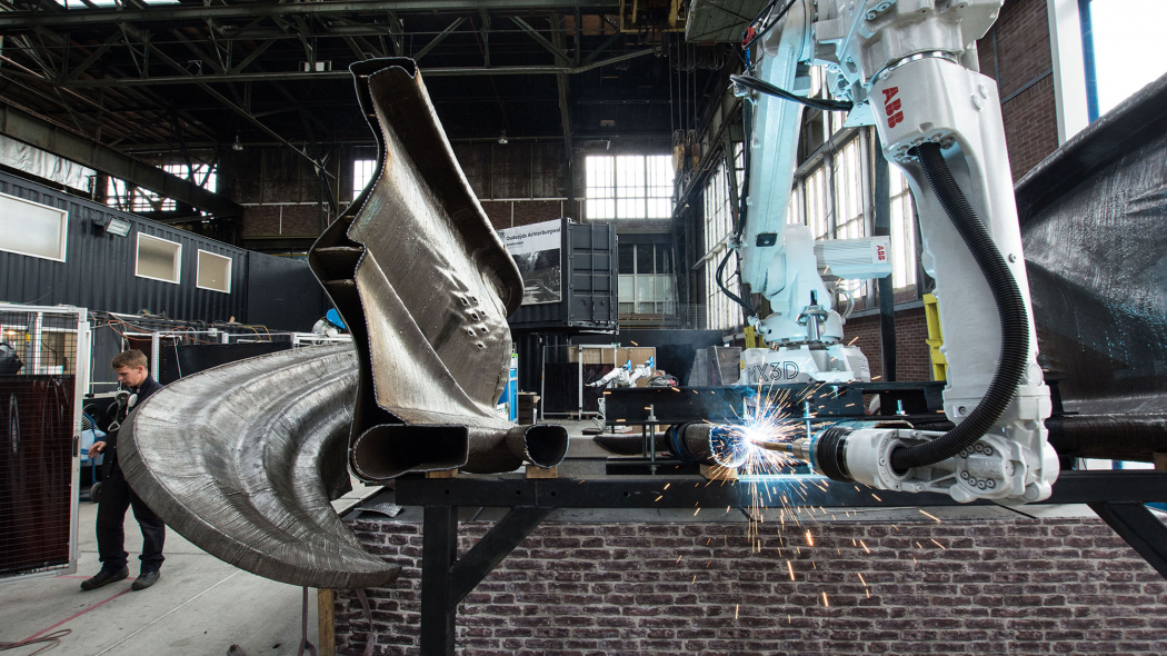 Het Amsterdamse startup-bedrijf MX3D ontwierp intelligente software, die een robot en lasapparaat omvormt tot een groot formaat printer. Dit maakt het 3D printen van metalen op een architectonische schaal mogelijk. Deze kersverse techniek biedt nieuwe mogelijkheden voor architecten en ingenieurs en levert potentieel materiaal reductie op.