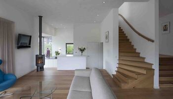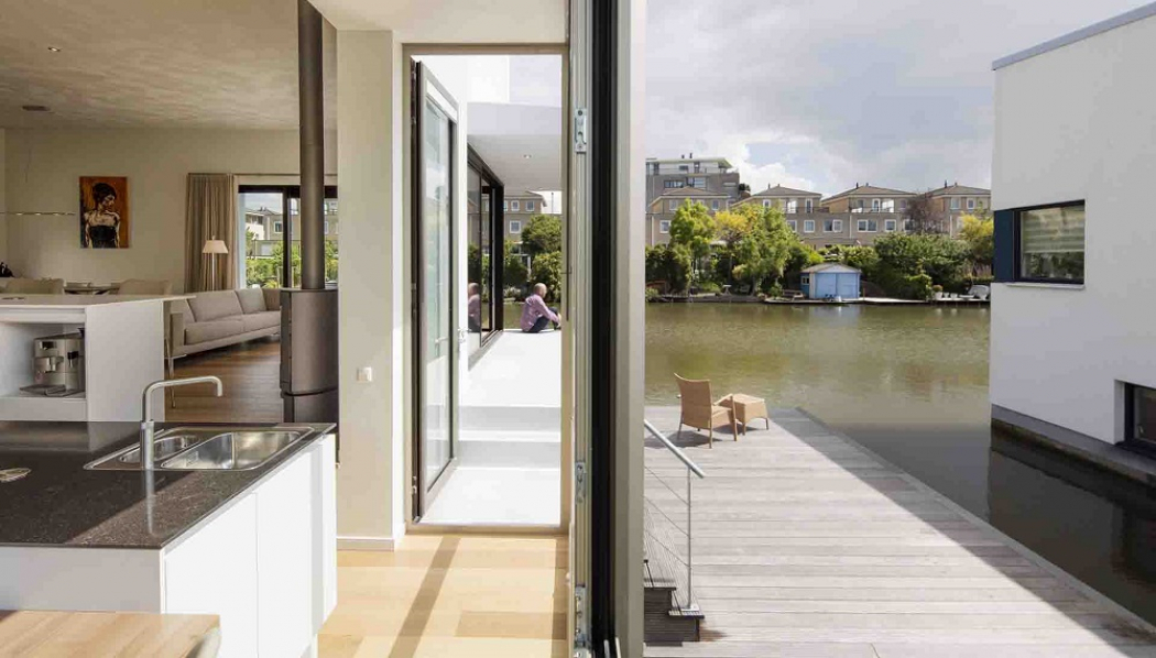 Het specifieke bouwsysteem gaf veel vrijheid in het ontwerp. De horizontale en verticale dimensies zijn in deze woning volledig benut om de woning zo ruimtelijk mogelijk te maken. Hierdoor is de entree vanaf de steiger gelijkvloers. Via een kleine trap wordt de woonkamer bereikt, die een oriëntatie in alle vier de windstreken heeft. Zowel in de woonkamer als in de keuken heeft de bewoner een mooi uitzicht over het water en de ochtend- en middagzon. Het uitkragende balkon als verlengstuk van de woonkamer maakt de binnen-buiten relatie optimaal. Vanuit de woonkamer is met een trap de bibliotheek bereikbaar. Deze heeft een open pui om beschut van de avondzon te kunnen genieten. Het raam van de bibliotheek naar de keuken maakt het rondzicht compleet.