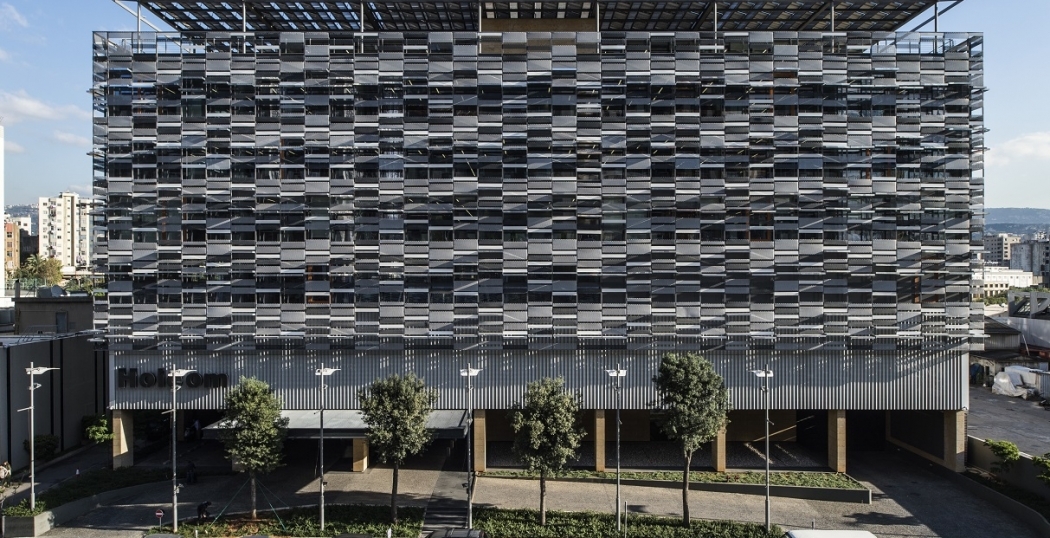 Het nieuwe hoofdkwartier voor bedrijf Holcom in Beiroet heeft wat weg van een enorm televisiescherm. Het gebouw brengt alle bedrijven onder Holcom samen en streeft daarmee naar interactie tussen culturen.