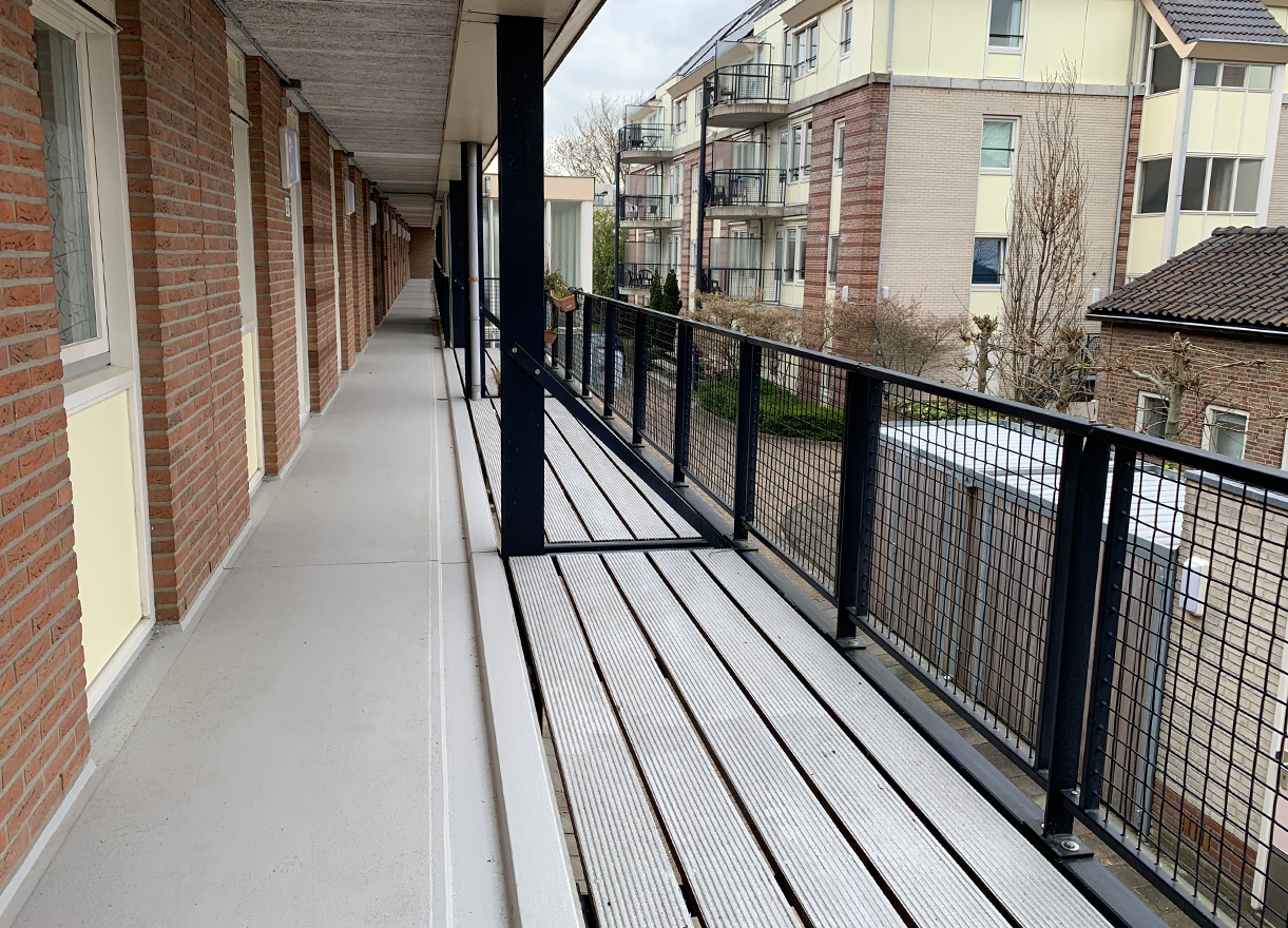 Zowel de opdrachtgever als de bewoners wensten een duurzame en goed te onderhouden vloerafwerking met voldoende stroefheid. Sealteq nam het project voor zijn rekening. Voor de galerijvloeren is er gekozen voor een hoogwaardig, ijzersterk en esthetisch membraan dat eigenschappen als waterresistent, scheuroverbruggend en naadloos in huis heeft. Aan een deel van de galerij is ook een houten vlonderdeel bevestigd, dat door verwering zeer glad en ontoegankelijk was geworden voor de mindervalide bewoners.