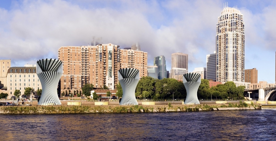 Impressie van drie INVELOX windturbines in Minneapolis.
