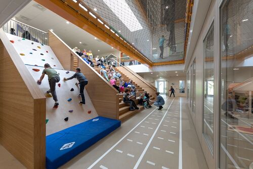 Met InFit Beweegconcepten ontwerpt en ontwikkelt De Rooij beweegconcepten, al bestempelt hij zichzelf niet als expert op gebied van bewegend leren. “Wij proberen beweegaanleidingen te maken, waar de school of andere experts vervolgens bewegend leren aan kunnen koppelen. Denk aan een boulderwandje dat de school kan gebruiken om kinderen tafels op te laten oefenen.” Precies dat soort beweegaanleidingen zie je terug in De Twijn. In de centrale beweegruimte zijn lijnen op de vloer gezet die kinderen stimuleren te rennen, langs de tribunetrap kunnen ze boulderen en verspreid over de gangen vind je speelaanleidingen zoals meubilair, basketbalringen en touwen om in te klimmen. “We zijn op zoek gegaan naar verschillende aanleidingen die kinderen van nul tot dertien jaar aanspreken”, zegt De Rooij. “Daardoor blijven de kinderen zo lang mogelijk uitgedaagd en ontwikkelen ze nieuwe vaardigheden.”
