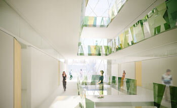 In het hart van het nieuwe schoolgebouw is de looproute verbonden met een ruimte waarin een doorgaande trap alle lagen verbindt. Deze trap voert bezoekers omhoog langs alle verdiepingen met onderweg steeds een ander uitzicht op de omgeving van het gebouw. De flexibele opzet van het onderwijsgebouw maakt het toekomstbestendig. Zo is het mogelijk om lokalen gemakkelijk om te bouwen voor meer studieplekken.