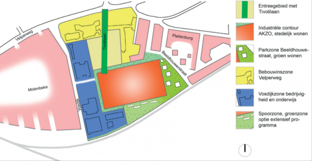 Het overgrote deel van het gebied wordt gebruikt voor een groot parkeerterrein. Daarnaast ligt een kleiner gebied braak. Dit stuk land wordt in het plan de fabriekszone genoemd, omdat hier vroeger de meeste fabriekshallen stonden. Ten noorden van hier is een appartementengebouw gerealiseerd aan de Novahof en Novalaan. Hiernaast is de entree van het gebied, de Tivolilaan.