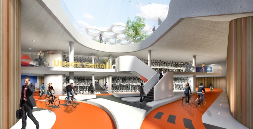 Een tweede uitdaging voor Utrecht was het realiseren van voldoende fietsparkeerplekken in de binnenstad, met name in het stationsgebied. Frans-Jan van Rossum is sinds 1 november 2013 een van de programmamanagers Bereikbaarheid bij de gemeente Utrecht en verantwoordelijk voor het onderdeel Fiets: “In het stationsgebied kennen we drie soorten fietsenstallingen. OVT stallingen, dat zijn stallingen die gelinked zijn aan het openbaar vervoer. Daarvan gaan we er vijf bouwen met een totale capaciteit van 22.200 plaatsen. Die capaciteit zou volgens ProRail voldoende moeten zijn tot 2025. Dan zijn er nog de stallingen in de openbare ruimte. Daarvan zijn er zeven gepland met in totaal 6010 plaatsen. En tenslotte de niet-openbare stallingen. Van dat type gaan we er negen realiseren met een totale capaciteit van 6580 plaatsen. Aan de grote bedrijven en instellingen in het stationsgebied (SNS, Rabobank, Jaarbeurs, Movares etc.) gaan we vragen om eigen fietsparkeervoorzieningen te realiseren.”