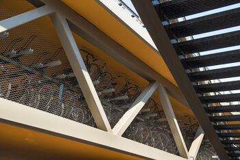 Een warm oranje gloed straalt vanaf de plafonds van de nieuwe fietsflat in Hengelo. Met het aanbrengen van de kleur op de plafonds is de stalling definitief gereed en volop in gebruik. Fietsenstallingen zijn vaak bepalend voor de eerste indruk van een stationsgebied. De focus bij alle ontwerpen voor fietsenstallingen en parkeergarages ligt daarom altijd in het realiseren van publiekskwaliteit, logistieke helderheid en oriëntatie.