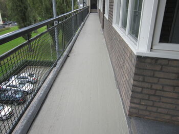 De kleur werd grijs. Zuithoff: "Lekker neutraal en tijdloos. De keramische tegels waren een beetje geel-roodkleurig. Grijs is wat minder smaakgevoelig en kan wel wat jaartjes mee." Net als de nieuwe Triflex-vloer. Die zorgt ervoor dat de galerijen duurzaam beschermd zijn. "Wij hebben ook een concurrerend product bekeken voor deze klus, maar Triflex kwam als beste uit de bus. Niet alleen qua prijs, onderhoudsvriendelijkheid en kwaliteit. De droogtijd was ook kort met slechts drie keer twee uur per galerij. Dat is voor onze bewoners natuurlijk wel zo prettig, want die kunnen anders geen kant op."