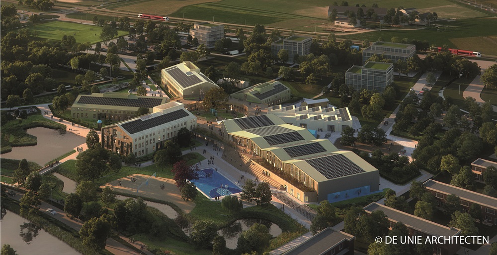 Het is een prachtig, multicultureel onderwijscomplex, daar aan het Damsterdiep in Appingedam. Sommigen noemen het ook wel een ‘educatief landschap’, waarbij de ruimtelijke indeling rond een centraal plein werd geïnspireerd door de historische wierden in Groningen. Vanuit de lucht zie je een schitterend geheel, bestaande uit zes verschillende gebouwen, met daarin vier onderwijsinstellingen.