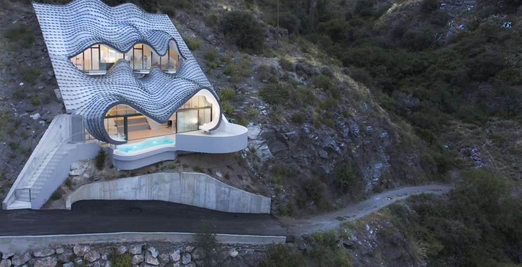 Door het gewelfde dak ontstaat een grotachtig interieur dat geïnspireerd is op het werk van Gaudi. “Het idee was het huis te integreren in het prachtige landschap en om de leefruimtes op de zee te richten,” aldus Pablo Gil en Jaime Bartolomé van GilBartolomé Architects. Zij beschrijven het gewelfde dag als ‘de huid van een draak’ gezien van onderaf en als ‘de golven van de zee’ gezien van bovenaf.