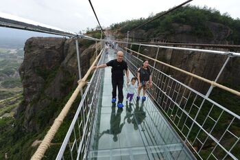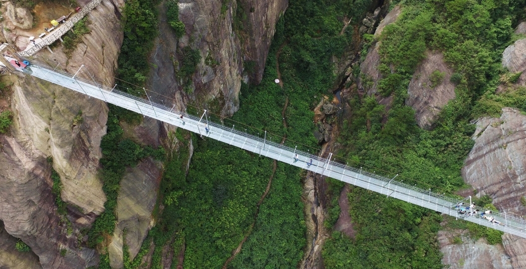 Op een nieuwe brug in het Chinese Shiniuzhai Nationaal Park is het lastig niet naar beneden te kijken. Het loopoppervlak van de hangbrug bestaat vrijwel geheel uit plexiglas. Met een lengte van 300 meter en op een hoogte van 180 meter wordt het ook wel de ‘engste brug ter wereld’ genoemd.