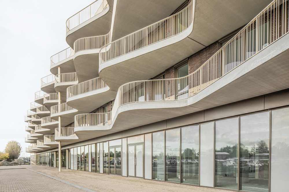 De stedenbouwkundig bepaalde horizontale uitwerking is doorontwikkeld tot een rondlopende en golvende balustrade. Deze geeft het gebouw een krachtige identiteit binnen het stedenbouwkundige ensemble. De gegolfde balkons hebben zicht over het water aan de oostkant en vangen het zonlicht uit het zuiden in de naar voren stekende punt. Tegelijkertijd geeft de gegolfde punt op de galerij aan de westkant een extra semi-private buitenruimte met avondzon. De gegolfde vorm zorgt voor passieve zonwering om oververhitting tegen te gaan. Ook zijn er twee vluchttrappen opgenomen in de golving van de galerij.