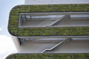 De groene wand is niet grondgebonden en bevat in totaal 11.000 verwisselbare plantcassettes.