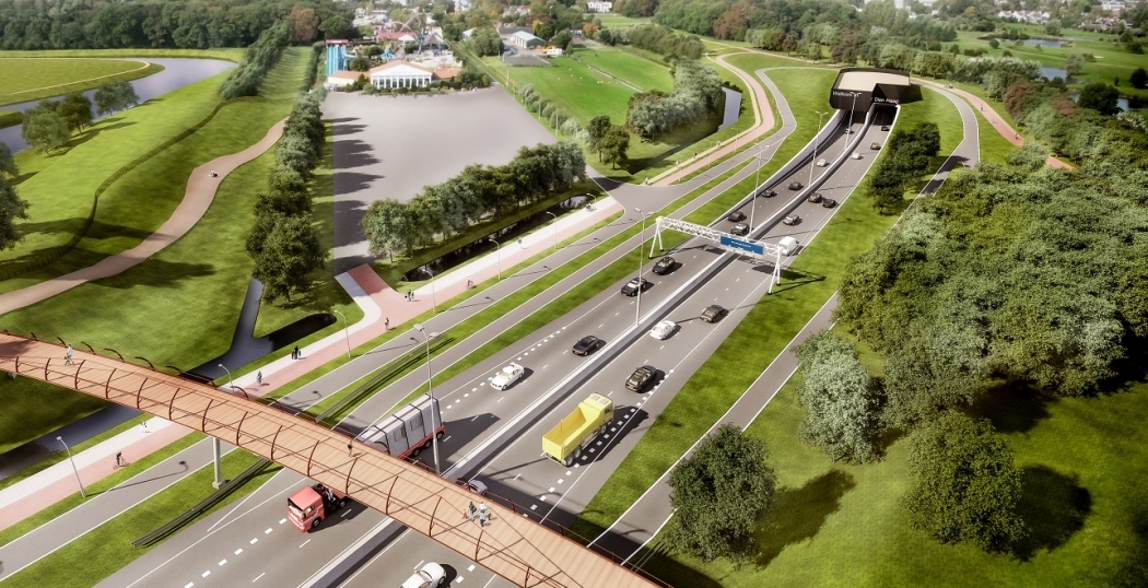 Zo ligt er een bijzonder ontwerp voor de tunnelmond in de Vlietzone: over het dienstgebouw en de tunnelmond heen komt een overkapping van zonnepanelen.