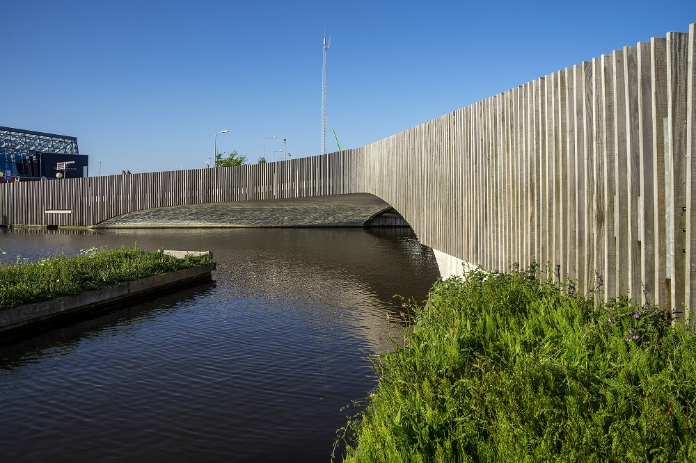 De Vlotwateringbrug in Monster, naar een ontwerp van Next Architects, is een architectonisch landschappelijk element met als extra functie huisvesting voor vleermuizen. Foto: © Betonhuis