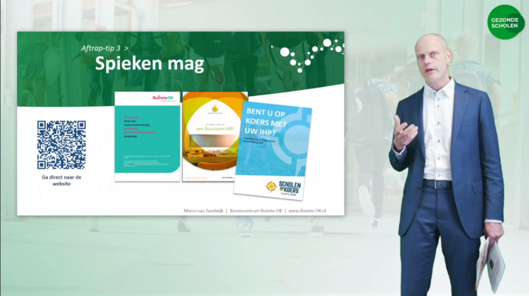 “Niets doen is geen optie”, zo trapte dagvoorzitter Marco van Zandwijk (Ruimte-OK) het event af. Want er is veel te doen in onderwijshuisvesting, van energie en klimaat tot ventilatie en financiering. Hoe temmen we dit monster? Volgens Van Zandwijk moeten we de opgave als kans zien om aan de slag te gaan. “Integraal denken, handelen én werken”, zegt hij, maar ook: “Spieken mag! We hebben alle informatie en kennis, dat is verankerd in ons doen en laten. Laten we dus vooral een kijkje nemen in elkaars keuken.”