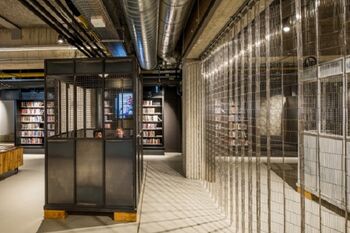 In de bibliotheekdelen vind je, net als in de rest van het gebouw, allerlei verwijzingen naar het mijnverleden van de regio. Zo is er een donker gedeelte met een verlaagd plafond dat omringd wordt met zwarte mdf boekenkasten met verstelbare blauwstalen legplanken. Op maat gemaakte mijnwerkersliftjes dienen als leescabines en een oldtimer leent zich perfect als ontvangstruimte voor groepen.