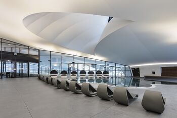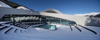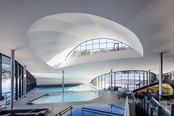 Het centrum is opgedeeld in twee onderdelen, ontspanning en amusement, die verdeeld zijn over twee verdiepingen. Transparantie stond centraal in het ontwerp, zo geeft architect Auer Weber aan. Dit wordt duidelijk gereflecteerd in de open zalen met minimalistische steunpilaren, een egaal wit plafond met fraaie openingen en veel ramen.