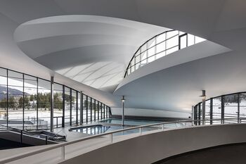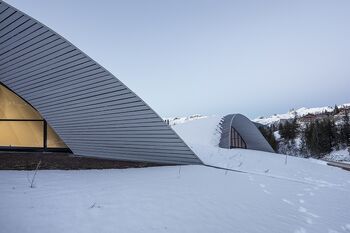Het eerste dat opvalt, is de gebogen dakconstructie. Deze laat zich leiden door de topografie van de omgeving en rijst slechts minimaal op uit het oppervlak. De binnenruimtes zijn dan ook deels ondergronds gebouwd. De open structuur laat een ruime glazen gevel toe, en ook openingen in het houten en glazen dak, waardoor het interieur geniet van veel zonlicht.