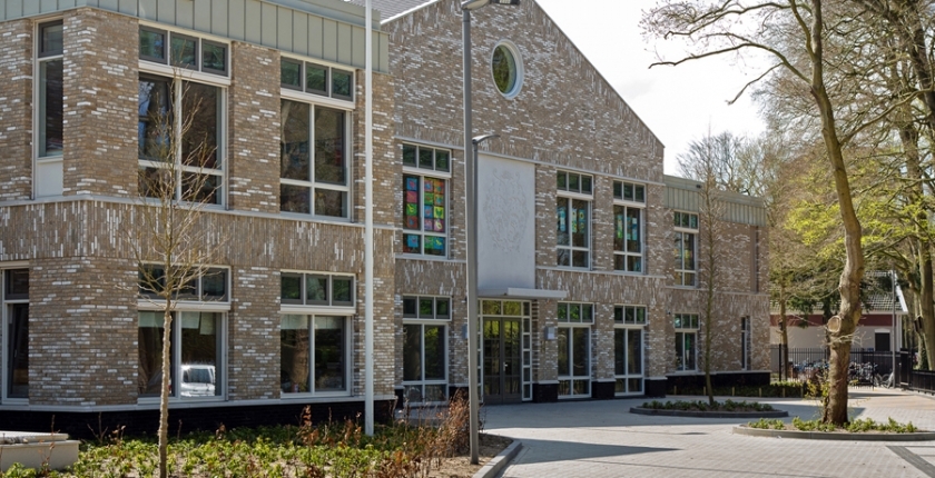 Het twee bouwlagen hoge schoolgebouw, uitgevoerd in een afwisselend patroon van lichtkleurige baksteen, is gebaseerd op de klassieke driedeling met in het midden een hoofdgebouw met zadeldak. Boven de entree met luifel prijkt het in beton uitgevoerde logo van de school. Dit geeft het pand een grandeur die bij binnenkomst versterkt wordt door de hoogte van de centrale hal. Hier worden bezoekers hoffelijk ontvangen. Tegelijkertijd is dit punt de ruimtelijke schakel tussen het hart van het gebouw en de aangrenzende plekken die bestemd zijn voor onderwijsactiviteiten.