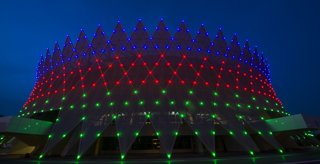Het Heydar Aliyev Sports and Exhibition Compex in Bakoe is het gebouw met de bijzondere gevel: een metalen geraamte met ruiten, in de vorm van een kroon. Op het raster zijn meer dan 1300 lampjes met RGB-kleurconfiguratie geplaatst.