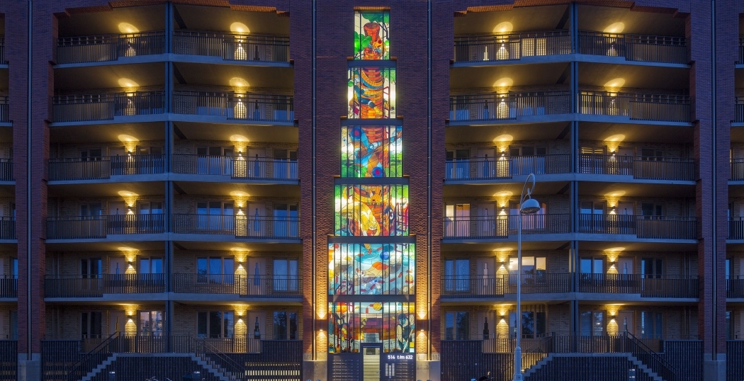 Langs de Polderweg in Amsterdam-Oost bouwde Ymere een nieuwbouwcomplex met 72 sociale huurwoningen. Twee mega glas-in-lood ramen in het gebouw vertellen de geschiedenis van het Polderweggebied.