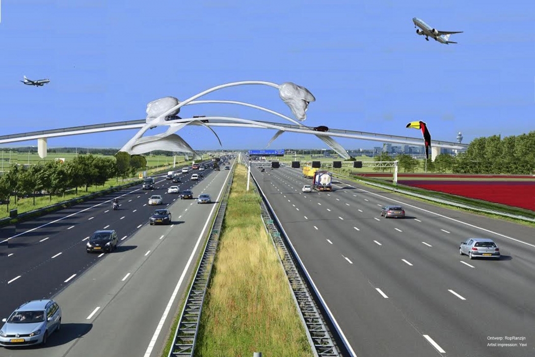 Hoe beter Hollands’ glorie uitbeelden dan met hét Hollandse icoon: de tulp. Designer Rop Ranzijn zocht voor het ontwerp van zijn brug inspiratie bij deze bloem, met als resultaat twee reusachtige tulpen die samen de A4 overbruggen.
