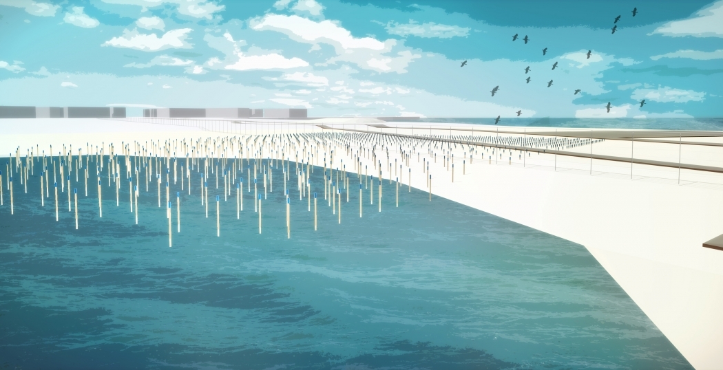 Artist impression van de kunstinstallatie De Pioniers Piketten door Équipe voor Architectuur en Urbanism en Arcam.
