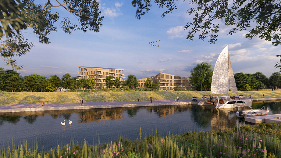 De variatie in bouwhoogten – vier, vijf en zes woonlagen – zorgt voor een mooie opbouw en doorzichten langs de volumes. Binnen de structuur is een ruime bandbreedte van appartementen van 71 vierkante meter tot penthouses van 245 vierkante meter. De onderste woonlaag ligt op 3 meter hoogte, zodat iedere woning zicht biedt over de dijk langs het kanaal. Parkeren gebeurt uit het zicht: de parkeergarage ligt deels verdiept en heeft een natuurdak dat aansluit bij de omgeving. Door de diagonale kap wordt de nok op de hoeken opgetild. Dit resulteert in een 4,5 meter hoge woonkamer voor de zes penthouses met indrukwekkend uitzicht over de polder en het water. Door de bewerking van de kap hebben deze woningen op de toplaag een beschut dakterras.