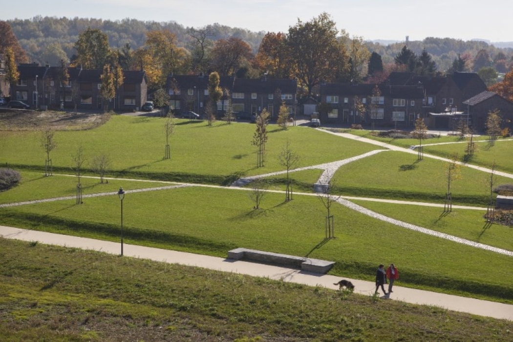 Het parkontwerp door Bureau B+B is gebaseerd op de bijzondere Zuid-Limburgse geologie. In de aardkorst zitten verticale breuken, waardoor sommige delen omhoog schuiven en andere omlaag. Zo ontstaan terrassen, of scheggen. Het bestaande hoogteverschil in het park wordt versterkt door kunstmatige scheggen met wisselende hoogtes. De scheggen creëren verschillende ruimtes voor uiteenlopende functies. Dwars door het park lopen doorgaande fietspaden, zodat er altijd levendigheid is. Het park wordt afgebakend door een rij levensloopbestendige woningen en een wijkgebouw. In het wijkgebouw zit onder andere een basisschool en een kinderdagverblijf. Het schoolplein ligt aan de voorkant van het gebouw en is direct verbonden met het park: De doorgaande weg die vroeger voor het gebouw langsliep is opgeheven. Het gebouw heeft ook twee afsluitbare binnenhoven. Hier bevinden zich de entrees en de buitenruimte van het kinderdagverblijf.