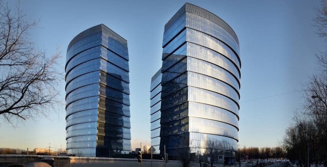 Een glanzend voorbeeld van architectuur die naadloos in de omgeving past, of hem zelfs bepaald. Het multifunctionele complex Lotus Business Center in Moskou wordt bepaald door een glazen gevel die door zijn wervelende ontwerp vanaf elk perspectief boeit.