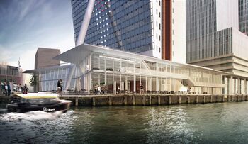 De uitbreiding wordt gekarakteriseerd door een volledige glazen gevel die ‘flirt’ met de bestaande pyloon. Het glas plooit zich vloeiend om de pyloon en volgt de schuinstand van dit iconische element. De nieuwe plint creëert een aantrekkelijke en transparante landing van de toren op de Wilhelminapier en maakt het gebouw toegankelijk aan drie zijden: straat, plein en kade. De uitbreiding functioneert als een ‘terminal’ en omvat onder andere een auditorium voor 350 mensen, 2 restaurants, een Experience Center en uitgebreide mogelijkheden om aan te sluiten bij de evenementen in Rotterdam en op de Wilhelminapier.